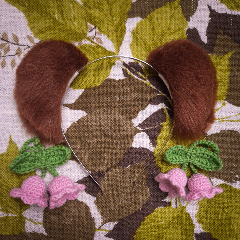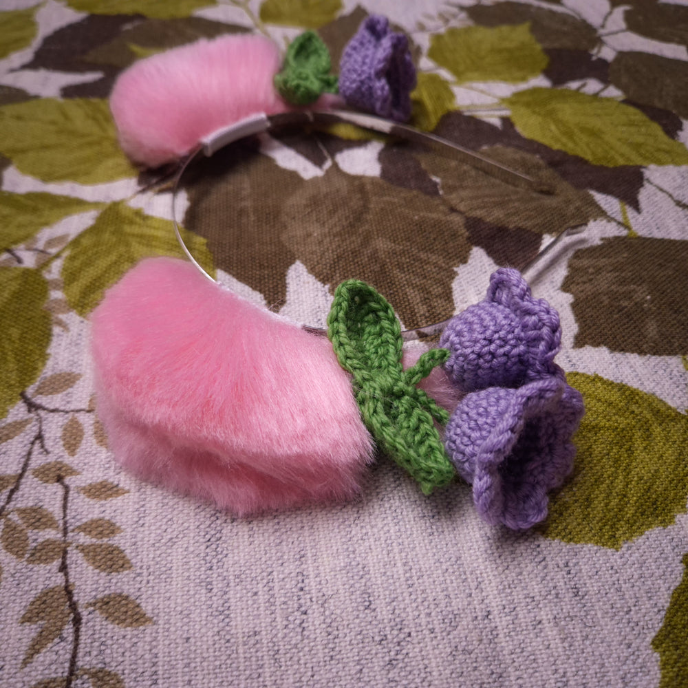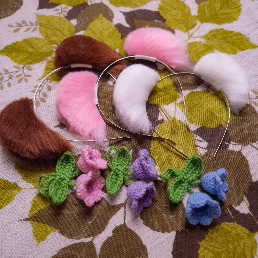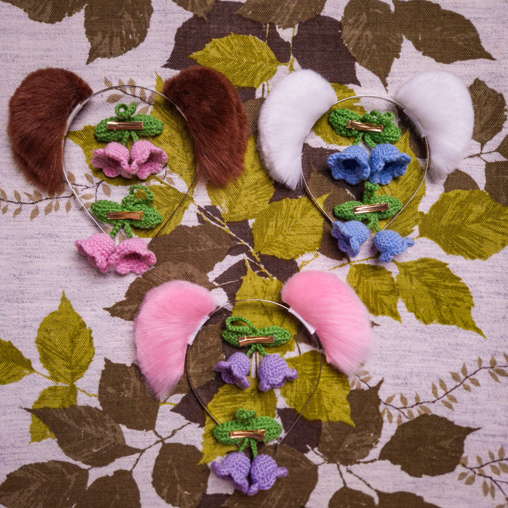 This set includes fantasy bear style faux fur ears on a metal headband, with two detachable crochet flower accessories. These ears fully wired, and attached with a stretchy fabric band for adjustability and comfort. You can select from three color options. The crochet flower accessories are made of wool yarn, and can also be worn as hair or bag accessories!