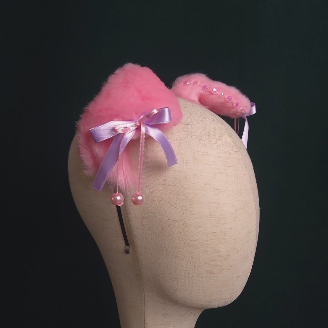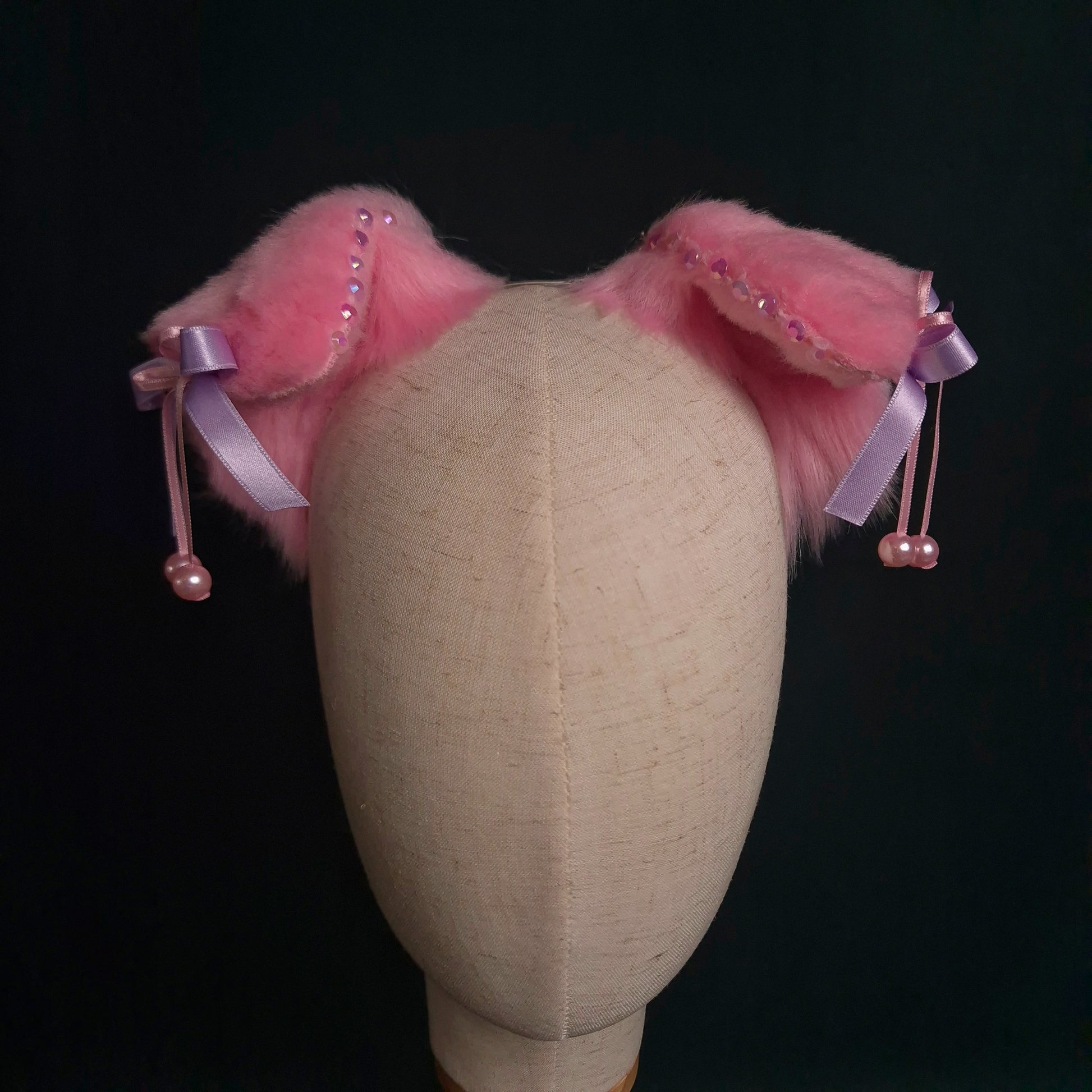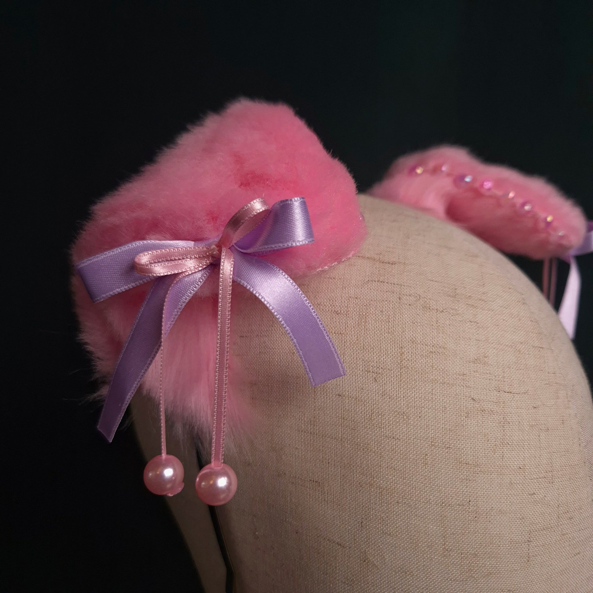 This set includes puppy style faux fur ears on a metal headband. This pair has bead decorations along the inner edge and cute bow accessories. Please note that these accessories are NOT detachable. Ears are fully wired and poseable and attached with a stretchy fabric band for adjustability and comfort.