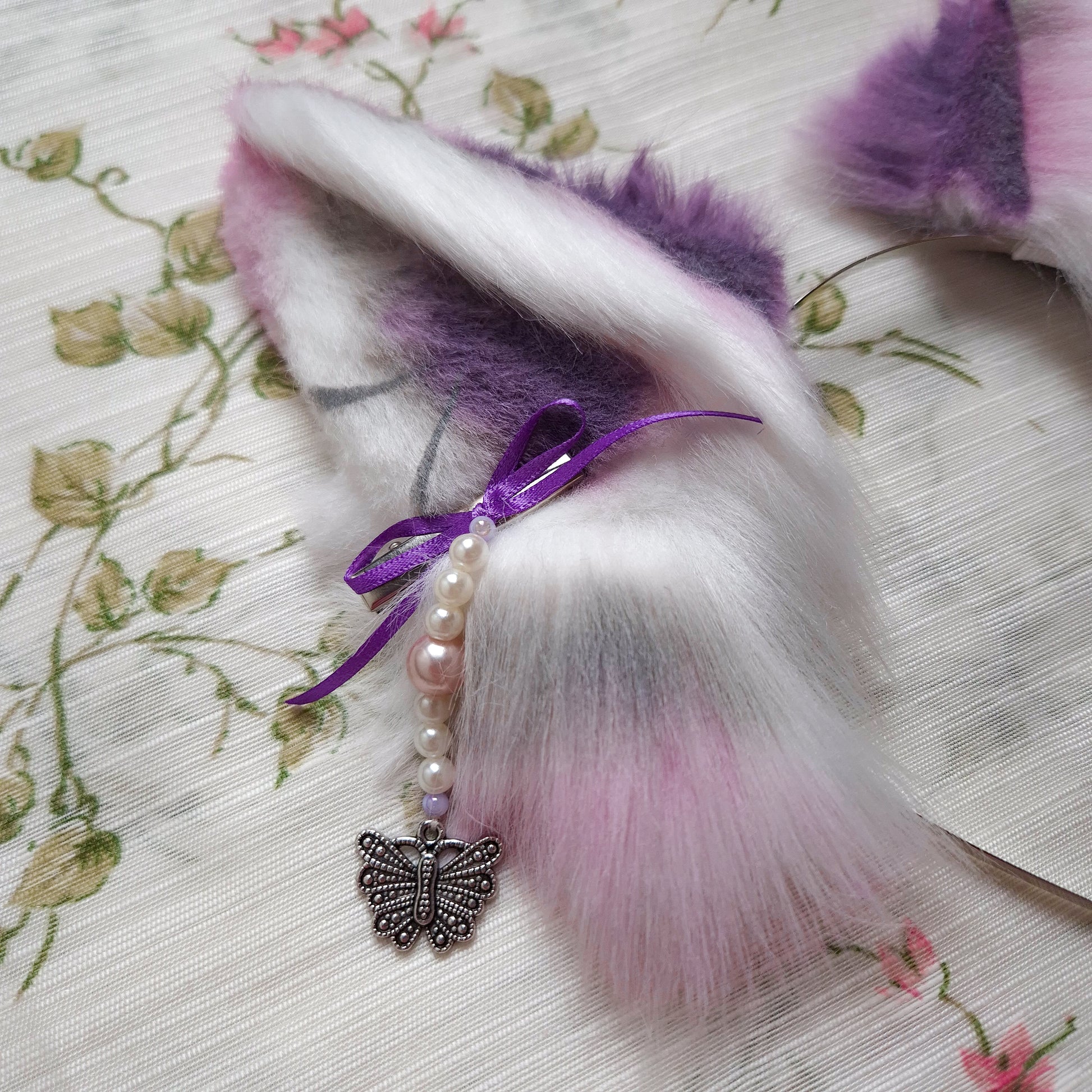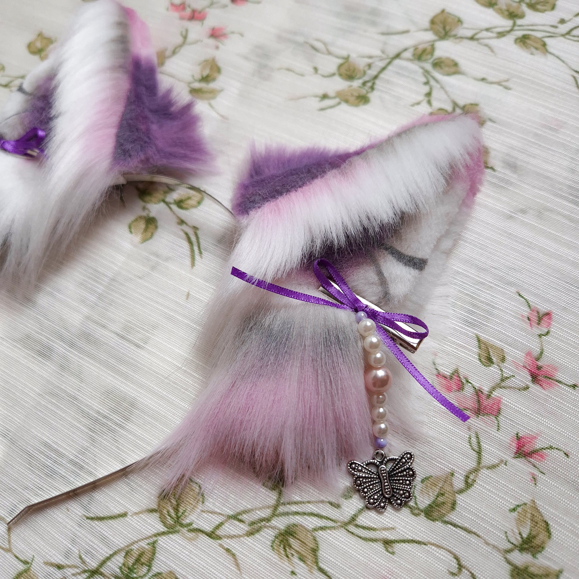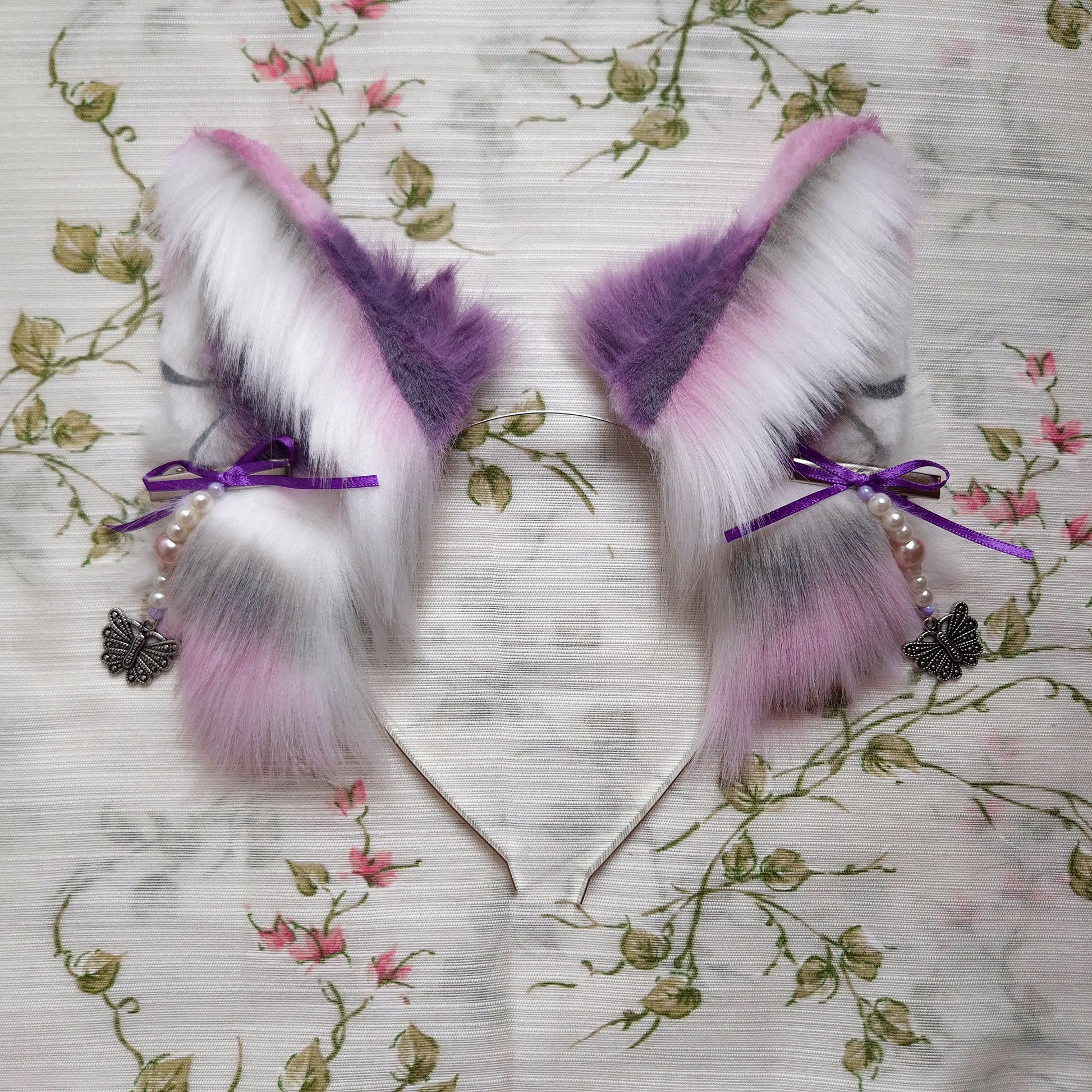This set includes fantasy wolf style faux fur ears on a metal headband, with two cute detachable ribbon accessories. Ears are fully wired and poseable and attached with a stretchy fabric band for adjustability and comfort.