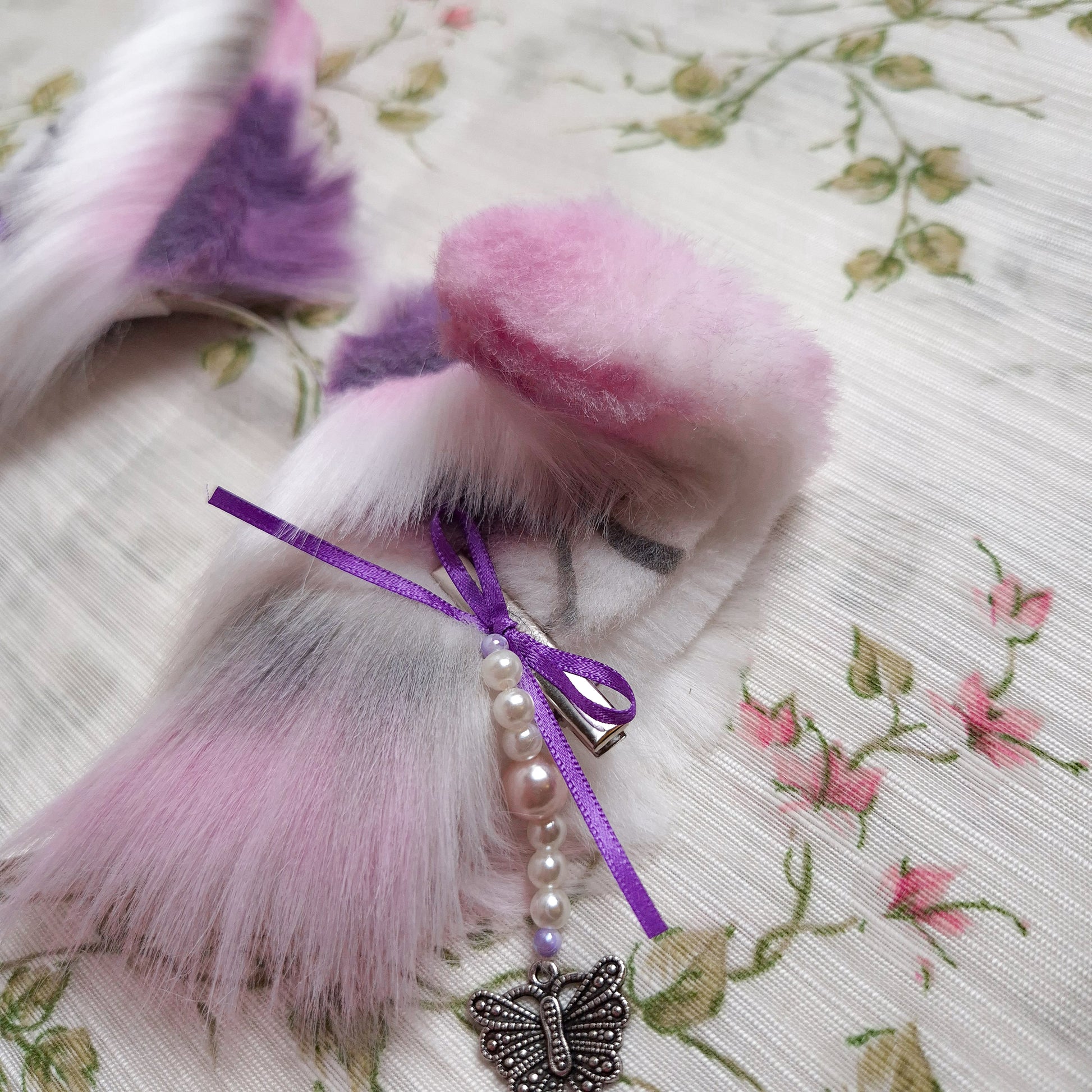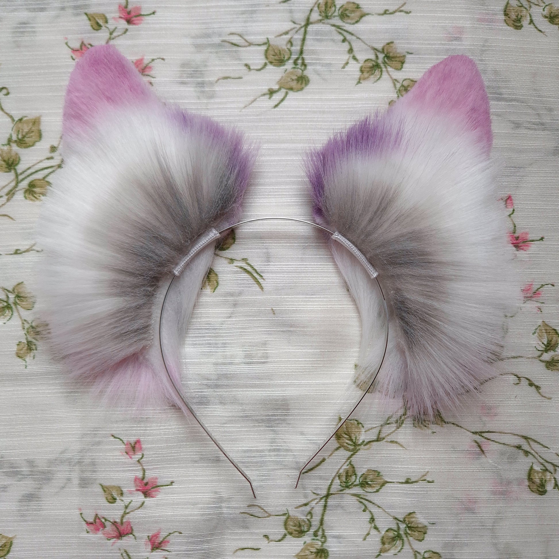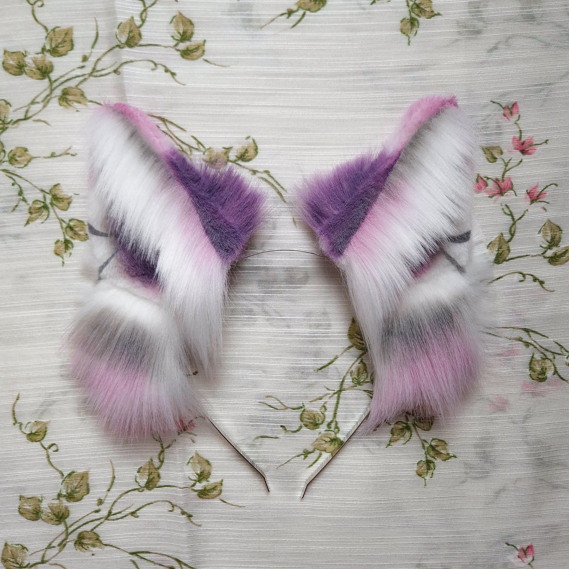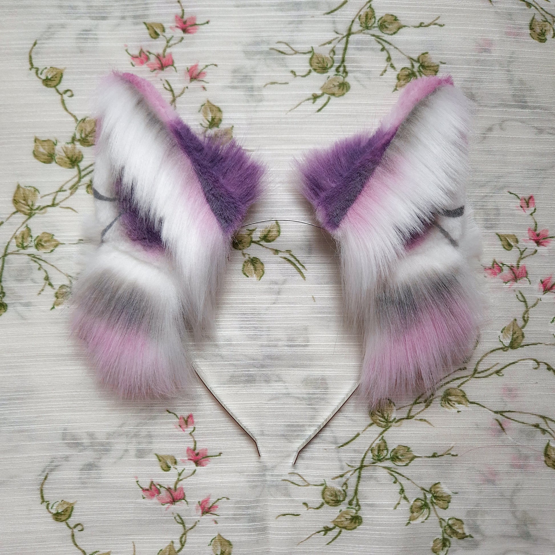 This set includes fantasy wolf style faux fur ears on a metal headband, with two cute detachable ribbon accessories. Ears are fully wired and poseable and attached with a stretchy fabric band for adjustability and comfort.